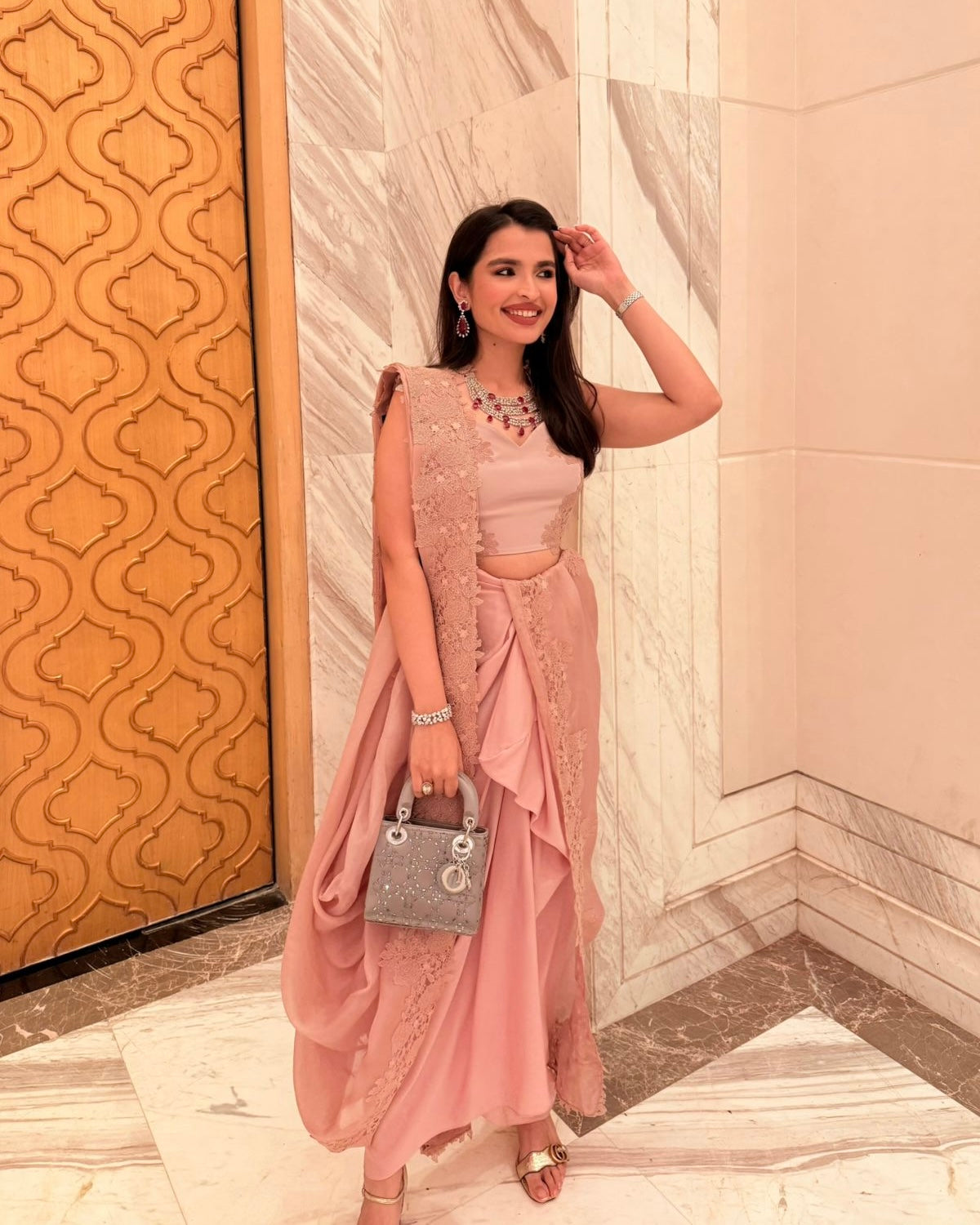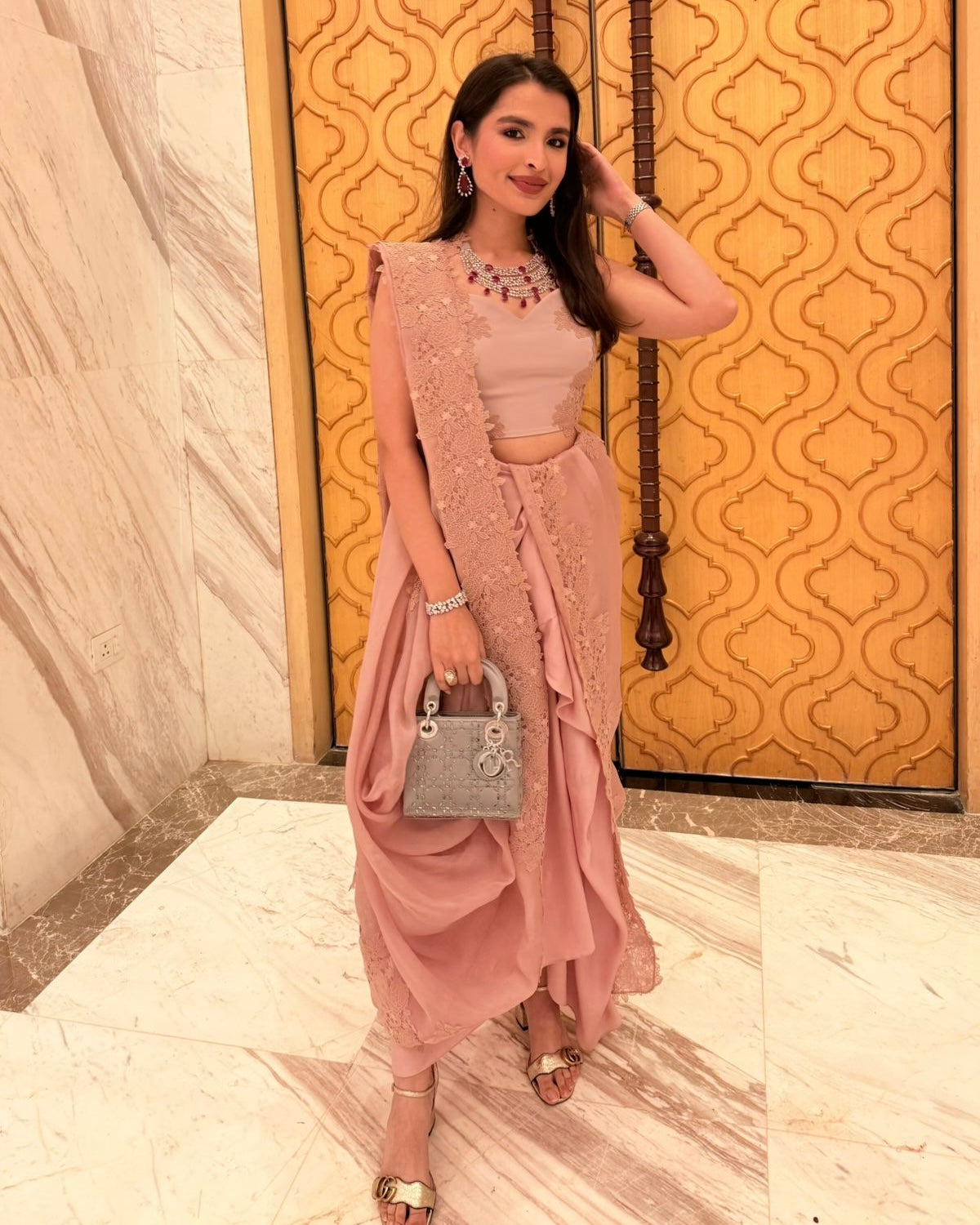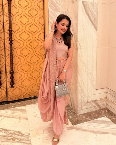 Old rose pre-draped Jacket saree with laced blouse and signature drape skirt. Fabric - Organza and Crepé
