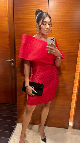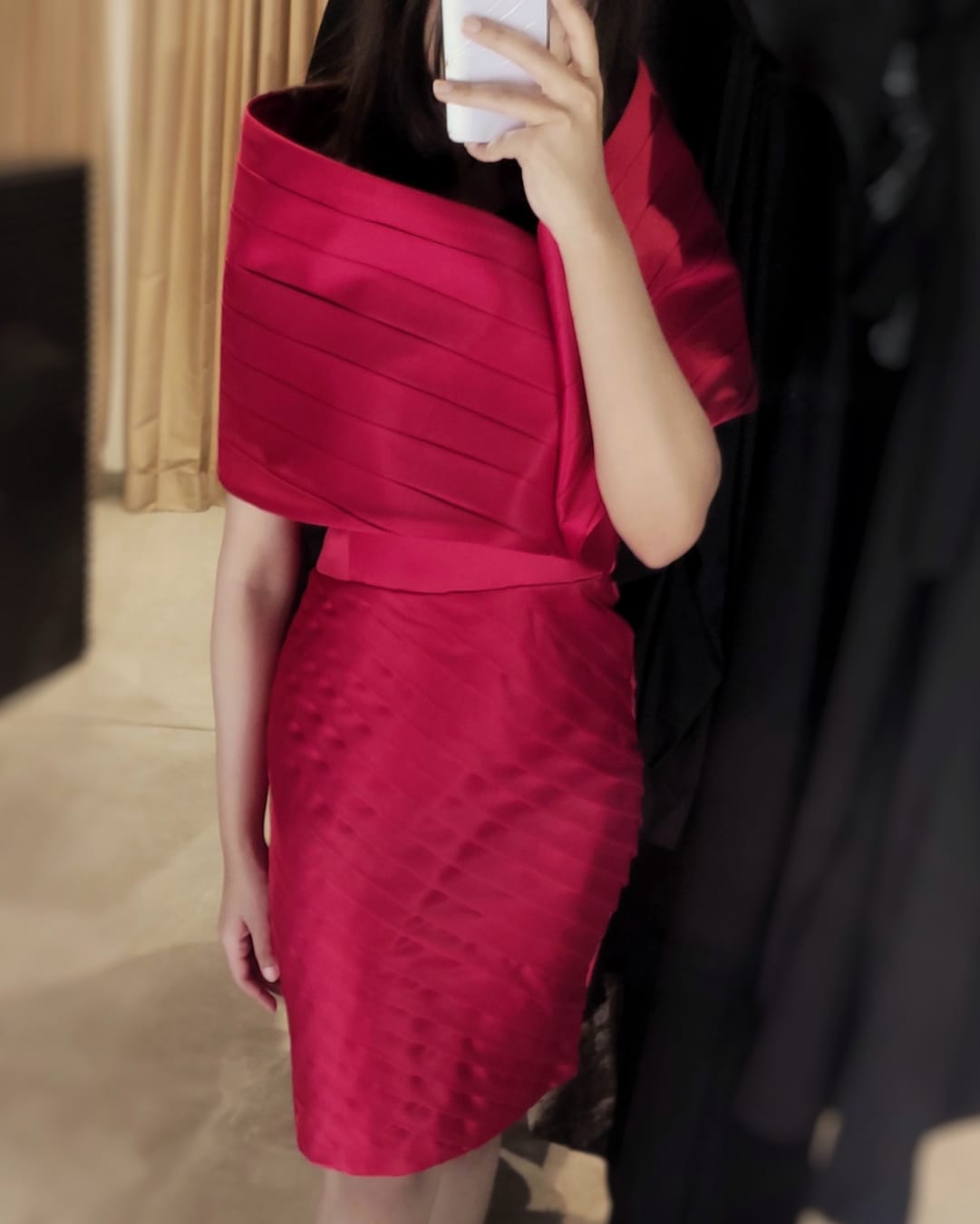 Red satin dress with pleated details