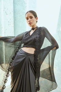 Black scallop-laced organza signature cape paired with embellished katdana blouse and signature drape skirt.